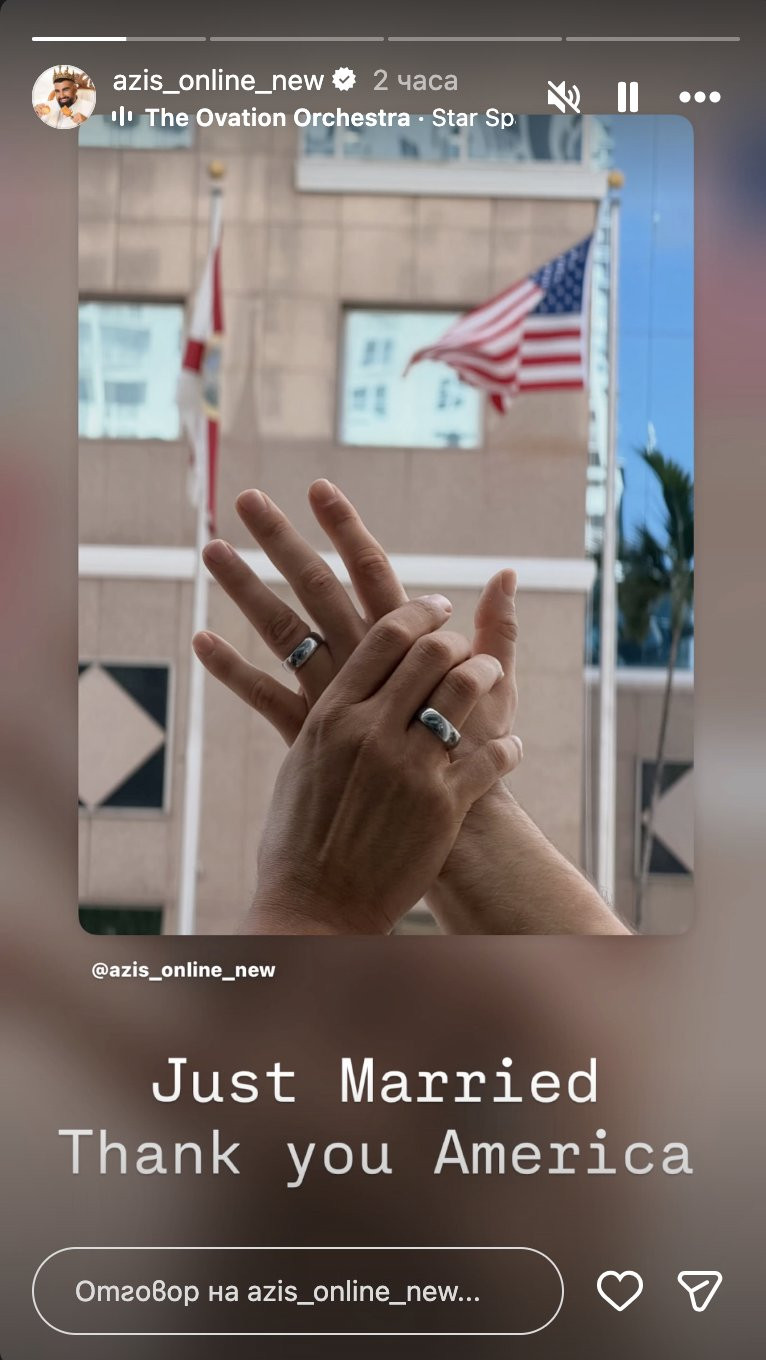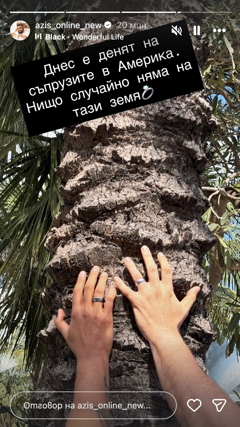 Кой е съпругът на певеца не става ясно. Единственото, което преди дни Азис сподели отново в социалните мрежи е, че той е хирург, американец е и е "съпруг-мечта".