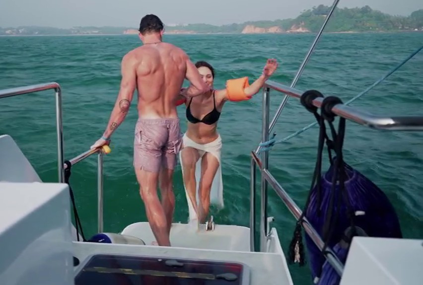 Макар официалната версия да беше фобия от удавяне, наблюдателните зрители на VOYO отчетоха и смущаващата липса на бански. Тихомълком изкусителната красавица се оказа докарана с черен сутиен, може би спасително предоставен на заем от екипа, но за долната част от облеклото не беше намерено алтернативно решение. Затова се наложи инфарктният скок от яхтата да бъде изпълнен с прозирната бяла пола, под която се виждаха бели бикини. Странният ансамбъл бе допълнен от нелепи оранжеви детски плувки за ръце, които определено убиваха сексапила на ситуацията.