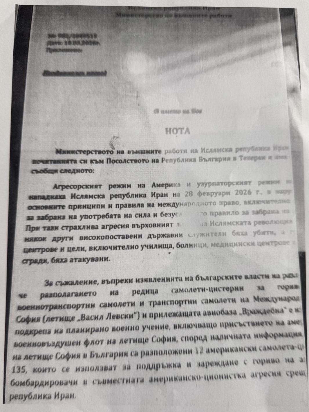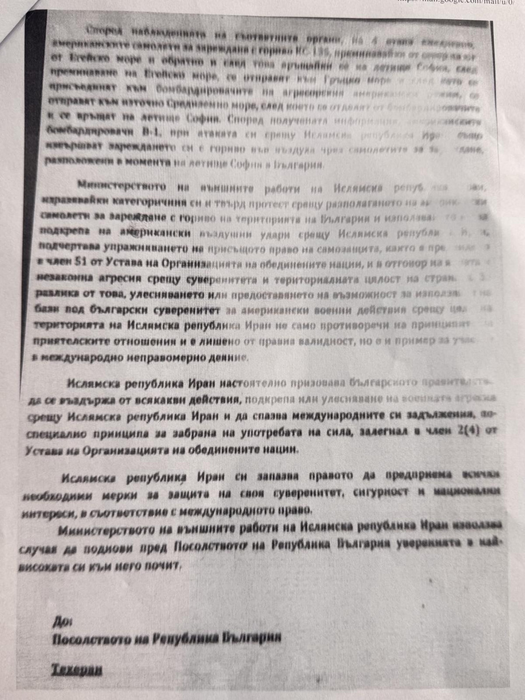 Той посочи, че има нота от Иран до Министерство на външните работи на България. В нея се заявява, че агресорският режим на Америка и узурпаторският режим на Израел са нападнали Иран в нарушение на международното право.