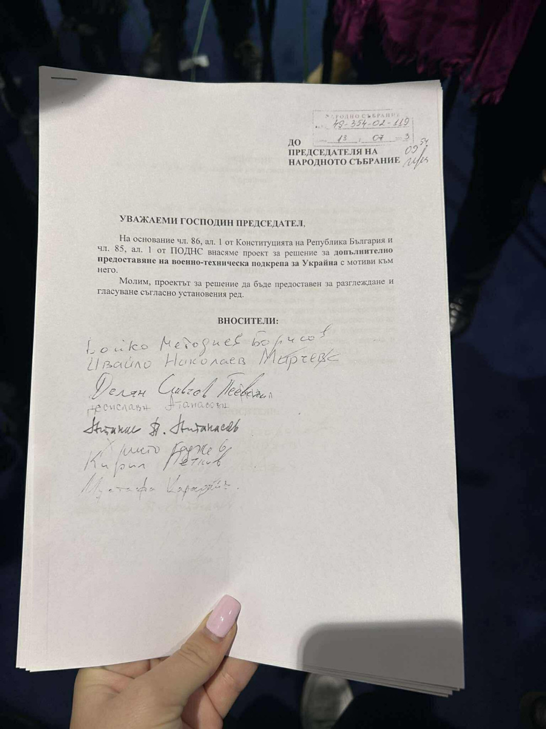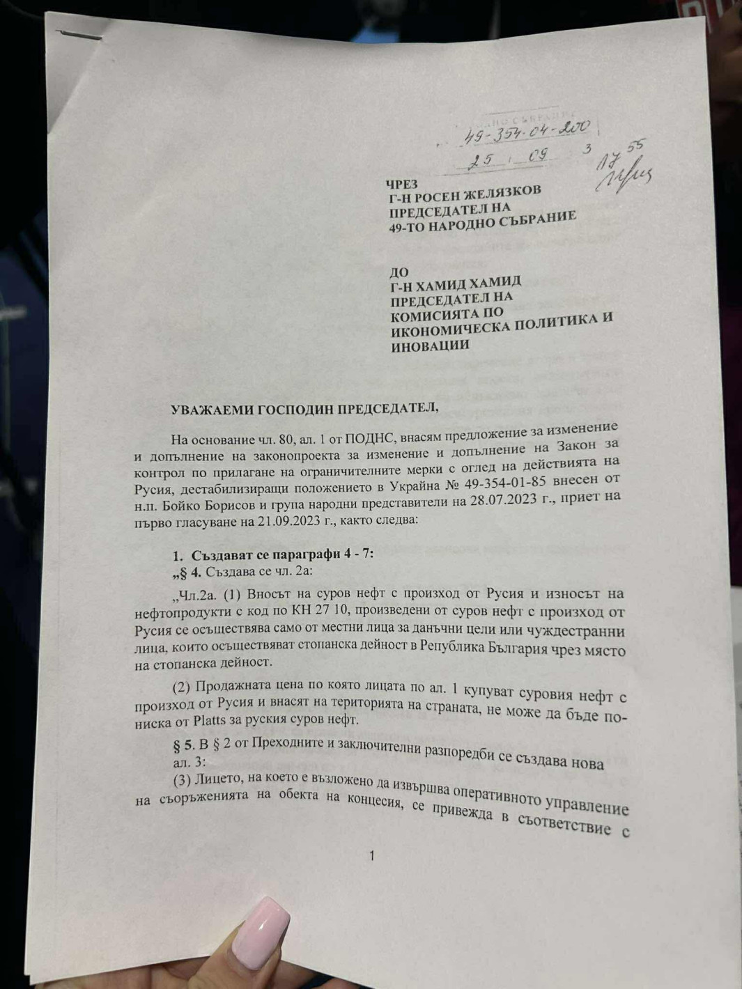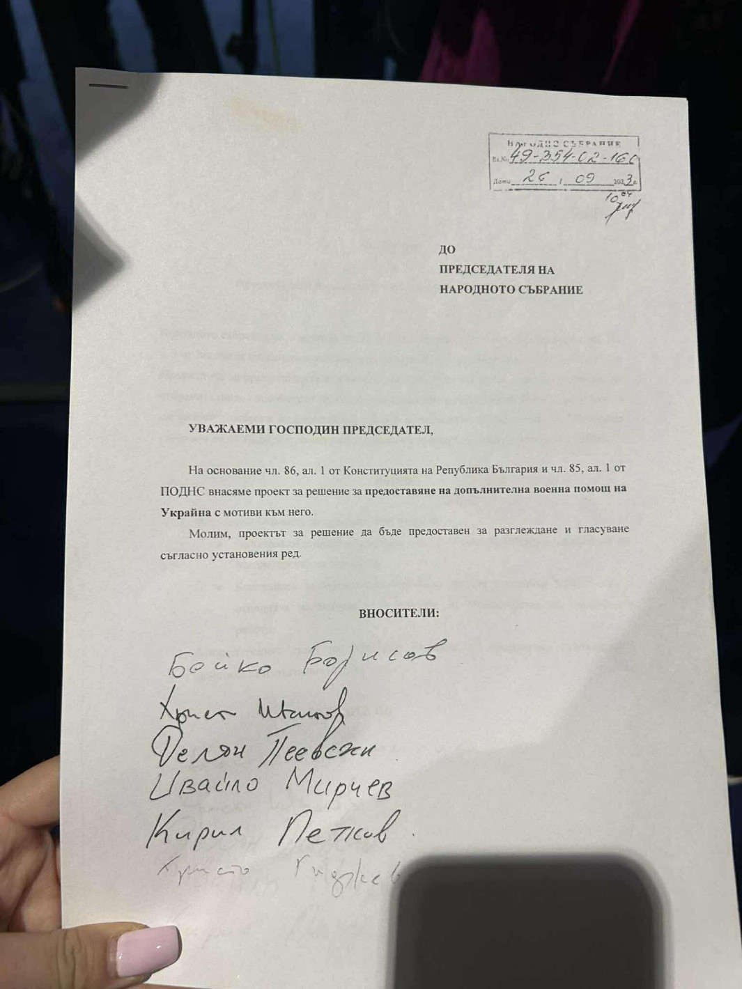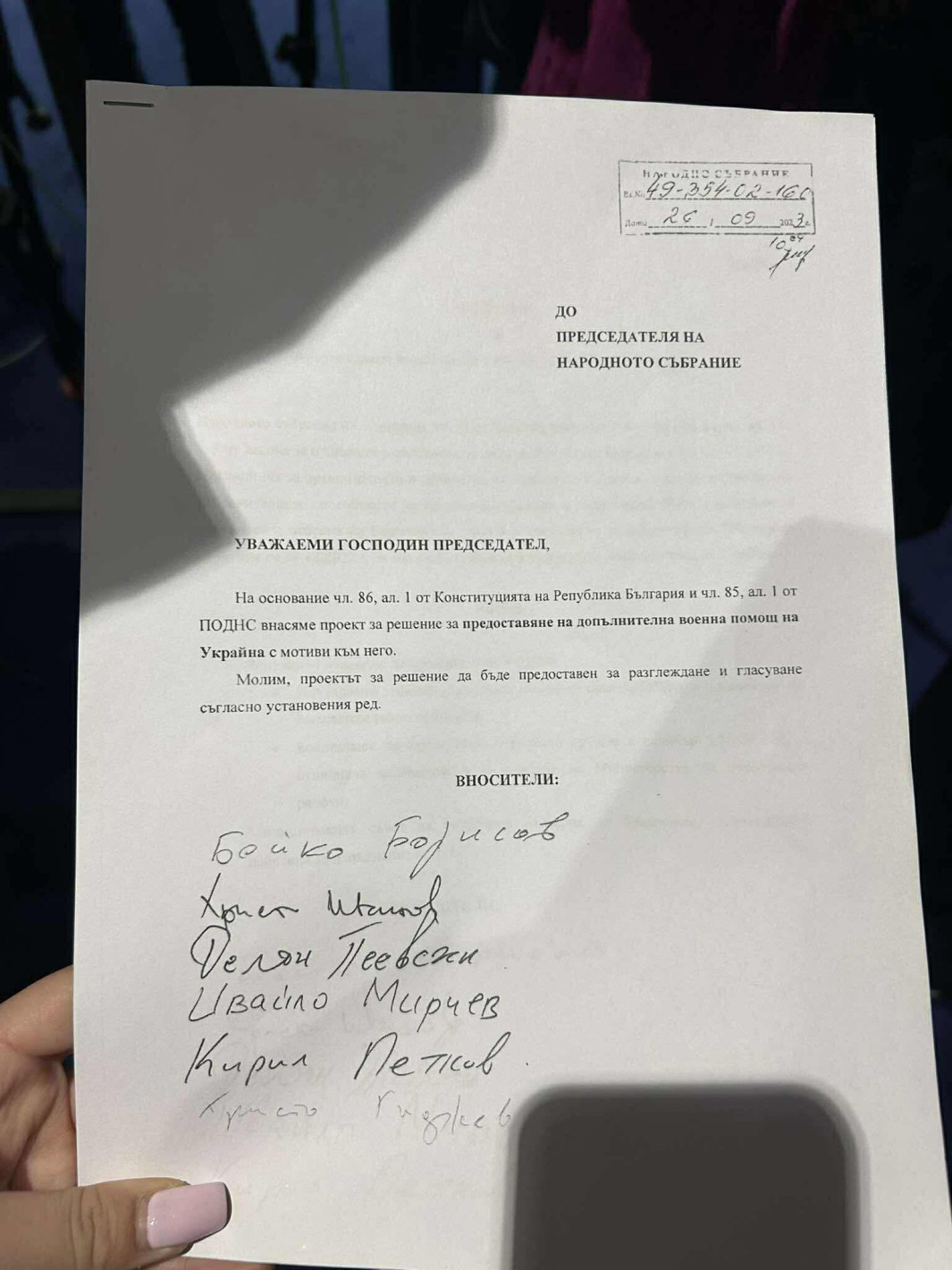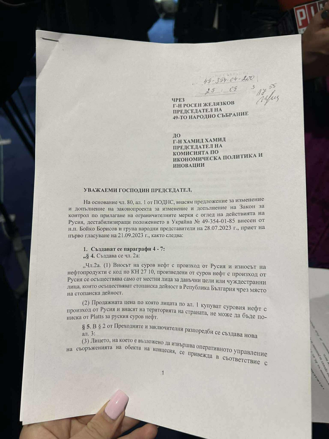 “Първо, аз обичам с факти да говоря. Това ви го давам, да си го снимате”, каза лидерът на ДПС-Ново начало Делян Пеевски, показвайки стари законопроекти от времето на сглобката, в които подписите му стоят редом до тези на председателите на ДБ и ПП.