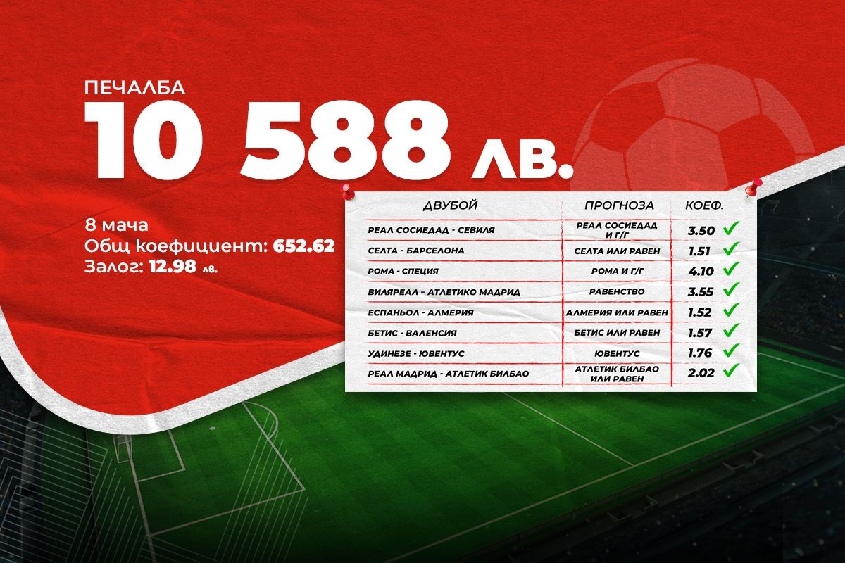 Благодарение на вярно познатите резултати от мачове в последните кръгове на първенствата на Испания и Италия, потребител на сайта, който постави множествен залог с осем срещи на стойност 12.98 лв. при общ коефициент 652.62, отчете печалба в размер на близо 8500 лв., към която бе добавен Бонус колонка на стойност над 2000 лв. Така, общата печалба на този клиент на сайта на WINBET достигна 10 588.85 лв.