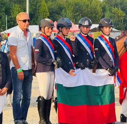 Отборът на България по конен спорт в дисциплината прескачане на препятствия при юношите - националният селекционер Ивелин Вълев, Елиза Чолакова, Драга Тодорова, Елена Хаджова и Марта Колушева. Съставеният изцяло от талантливи момичета тим завоюва балканската титла за 2025 година.