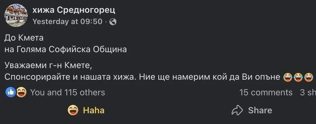 Спонсорирайте и Вашата хижа. Ние ще намерим кой да Ви опъне 😂😂😂”.