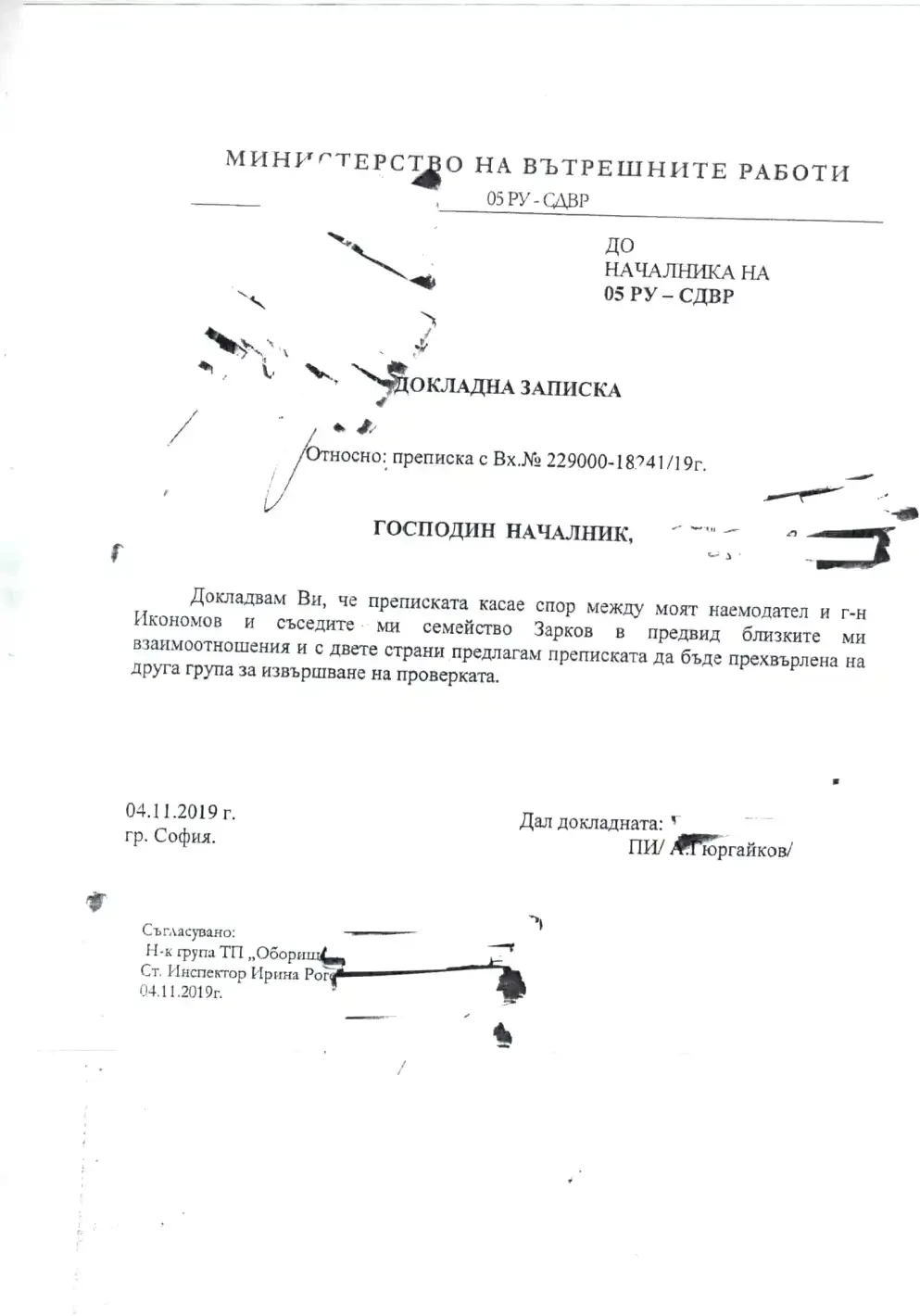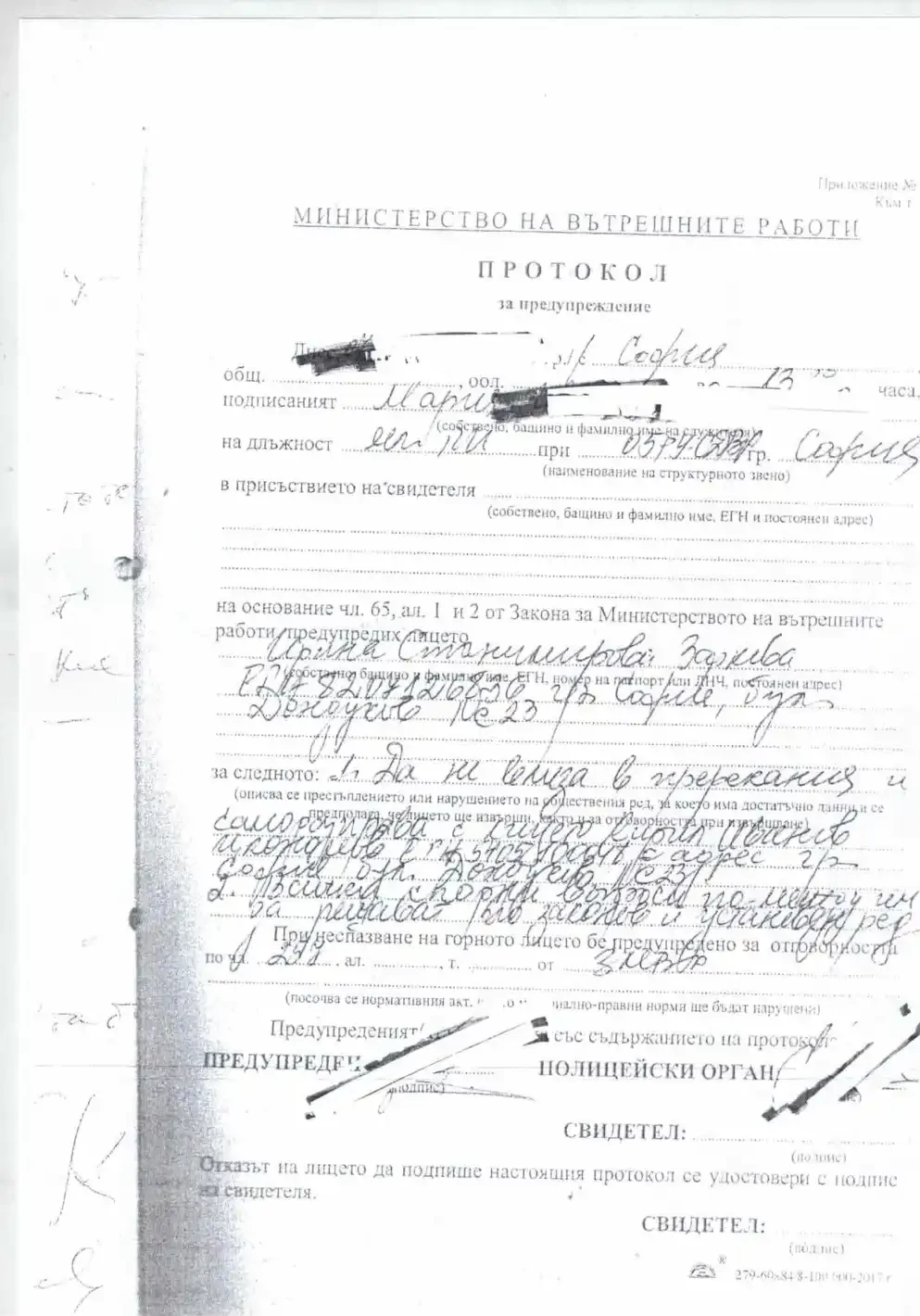 В полицейската преписка откриваме и Протокол за предупреждение срещу съпругата на Крум Зарков - Ирина Заркова. Те я предупредена да не влиза повече в "пререкания и самоуправство с лицето Кирил Икономов". Приложено е и обяснението на лицето Крум Зарков.